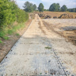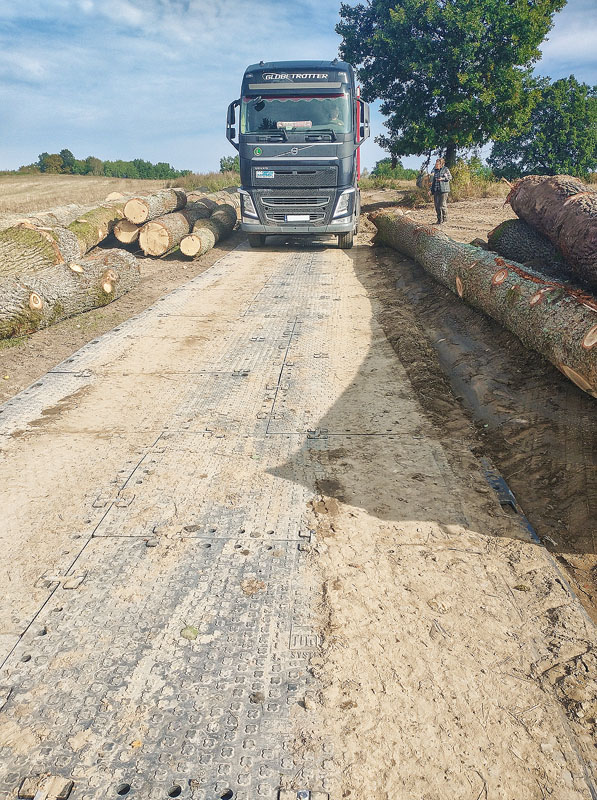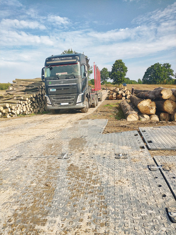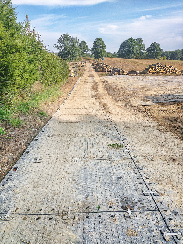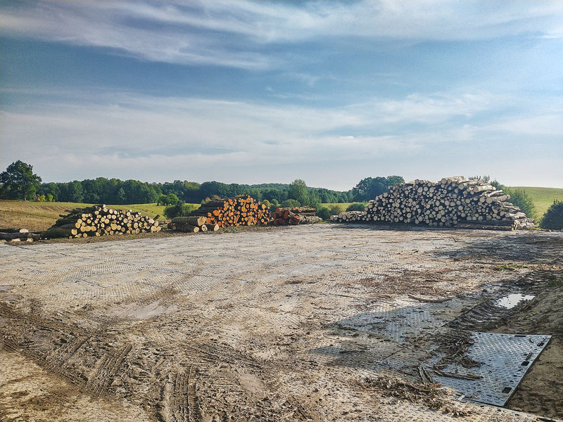 Utwardzono drogę dojazdową oraz plac do składowania drewna. Dzięki możliwości naprzemiennego montażu płyt uzyskano optymalną szerokość drogi. Po zakończeniu prac tymczasową nawierzchnię można bezproblemowo zdemontować i ułożyć w innym miejscu. W rezultacie płyty ROAD SYSTEM sprawdziły się jako ekonomiczne i wygodne w użytku rozwiązanie.